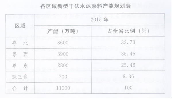 (二)粤北地区要充分发挥石灰石资源丰富和小水电丰富的优势,有序发展新型干法水泥,原则上不新建水泥粉磨站。争取到2015年底前,新型干法水泥熟料产能达到3600万吨左右,占全省比重32.73%。
